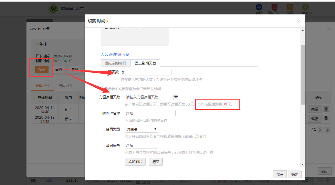 请假请不了,提示“请假天数不能超过剩余可请假天数!”,通过点击卡片上面的续费二字,时间填0 ,充值他的请假天数,请假天数充值好之后再操作请假就可以了。这种情况一般用来处理会员的请假天数超过了俱乐部本身设置的,所以需要单独处理。