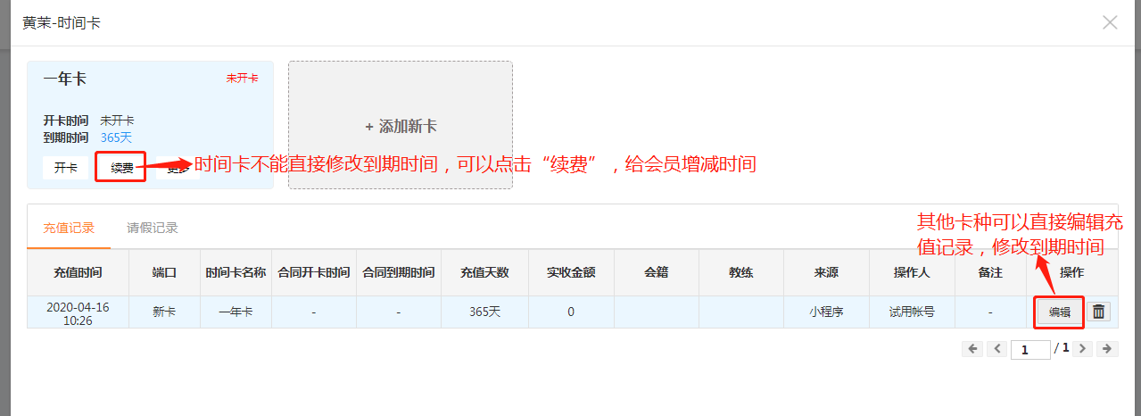 私教卡、次卡--充值记录点编辑栏进行修改(没有编辑就是子账号没有权限,跟俱乐部负责人联系)
