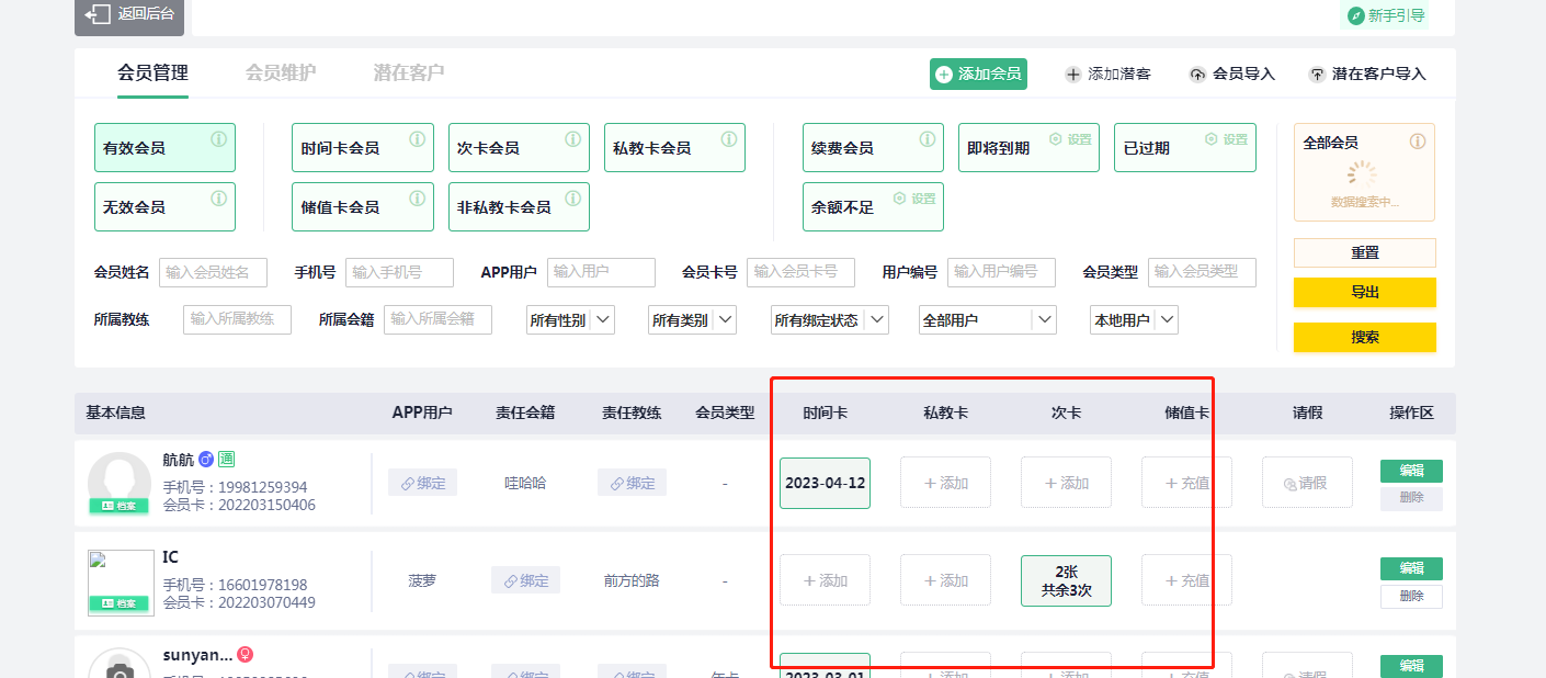 1、点击“会员管理”-搜到到对应的会员资料,点击到需要修改时间的卡里面去。