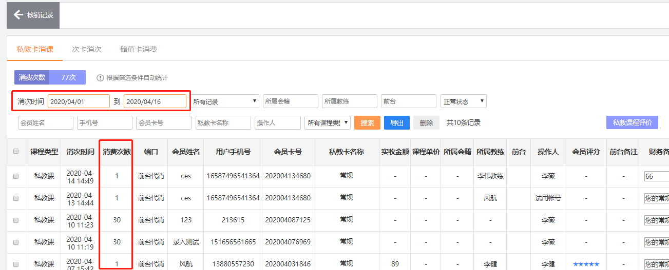 电脑端系统,财务版块--核销记录--私教卡消课。可以按教练或者时间段搜索,也可以导出成表格