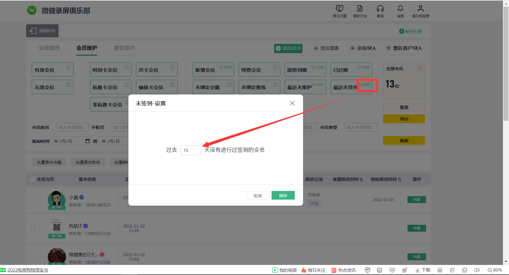 如何查看最近没有来俱乐部锻炼的会员