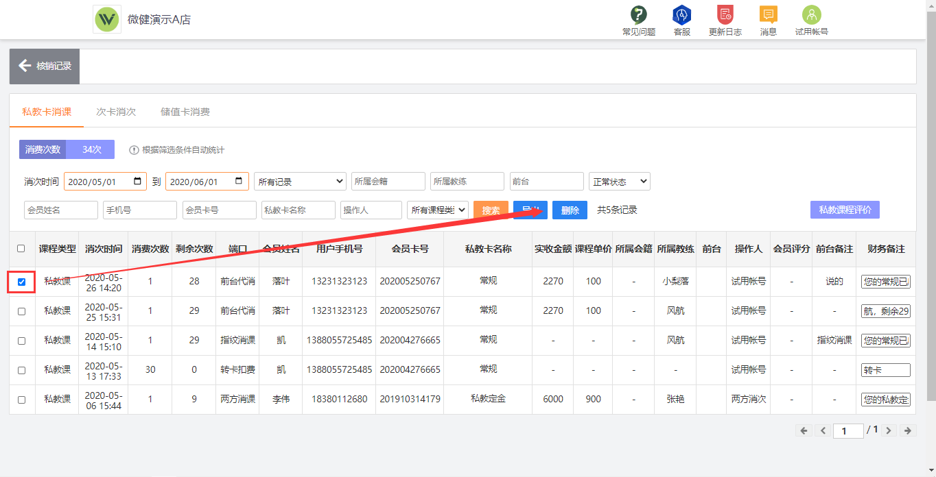 不能撤销,可以删除消课记录,再重新给会员续费一节,重新消一次