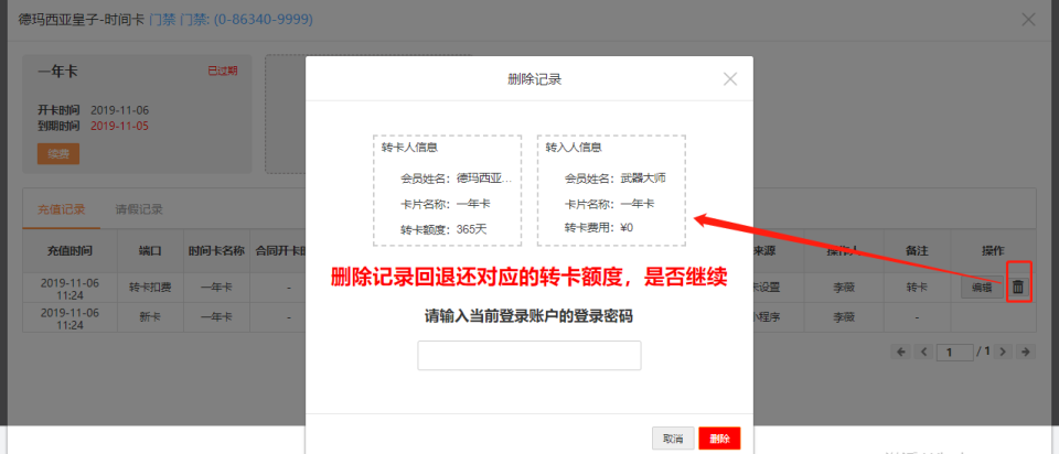 会员管理--找到转出人--点相应卡片进去--删除转卡充值记录(会提示转卡情况会原路返回)