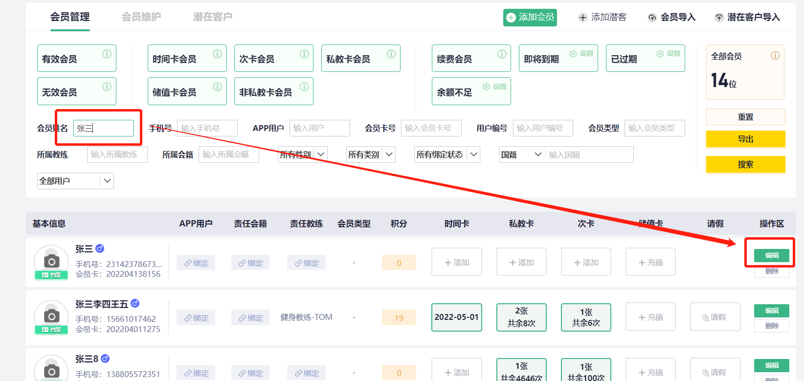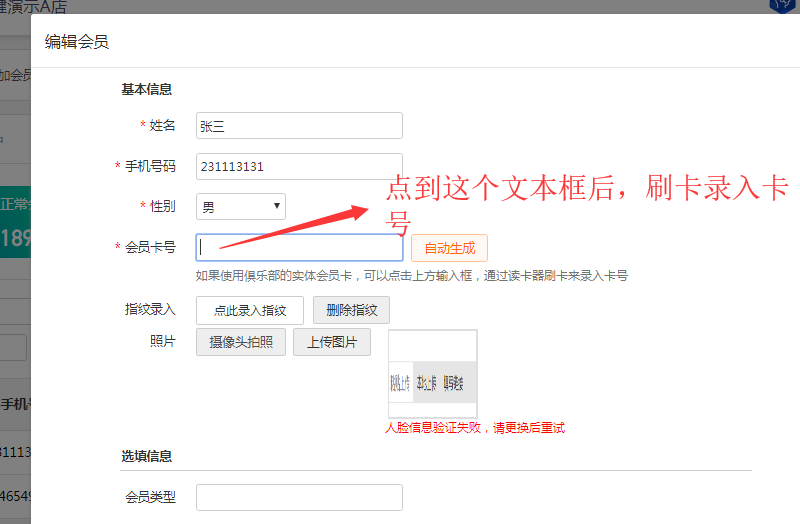 1、在会员管理搜索姓名或者手机号找到该会员,点击编辑,点到卡号那一栏,刷卡录入卡号(注意:不能手动输入卡表面的数字)。