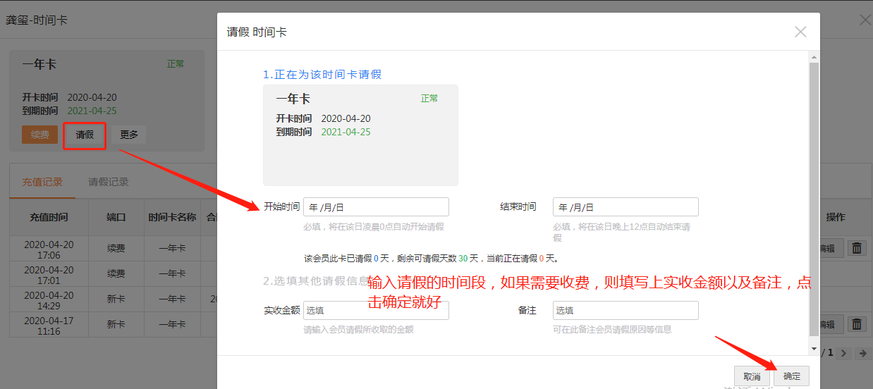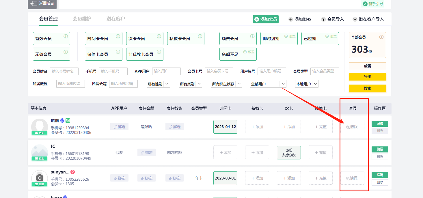 点击会员信息后面的“请假”图标,操作如下图
