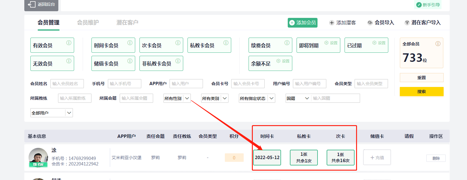 2、如果会员有多张卡,需要一起停卡的话,那么一样的在“会员管理”页面搜索到对应的会员