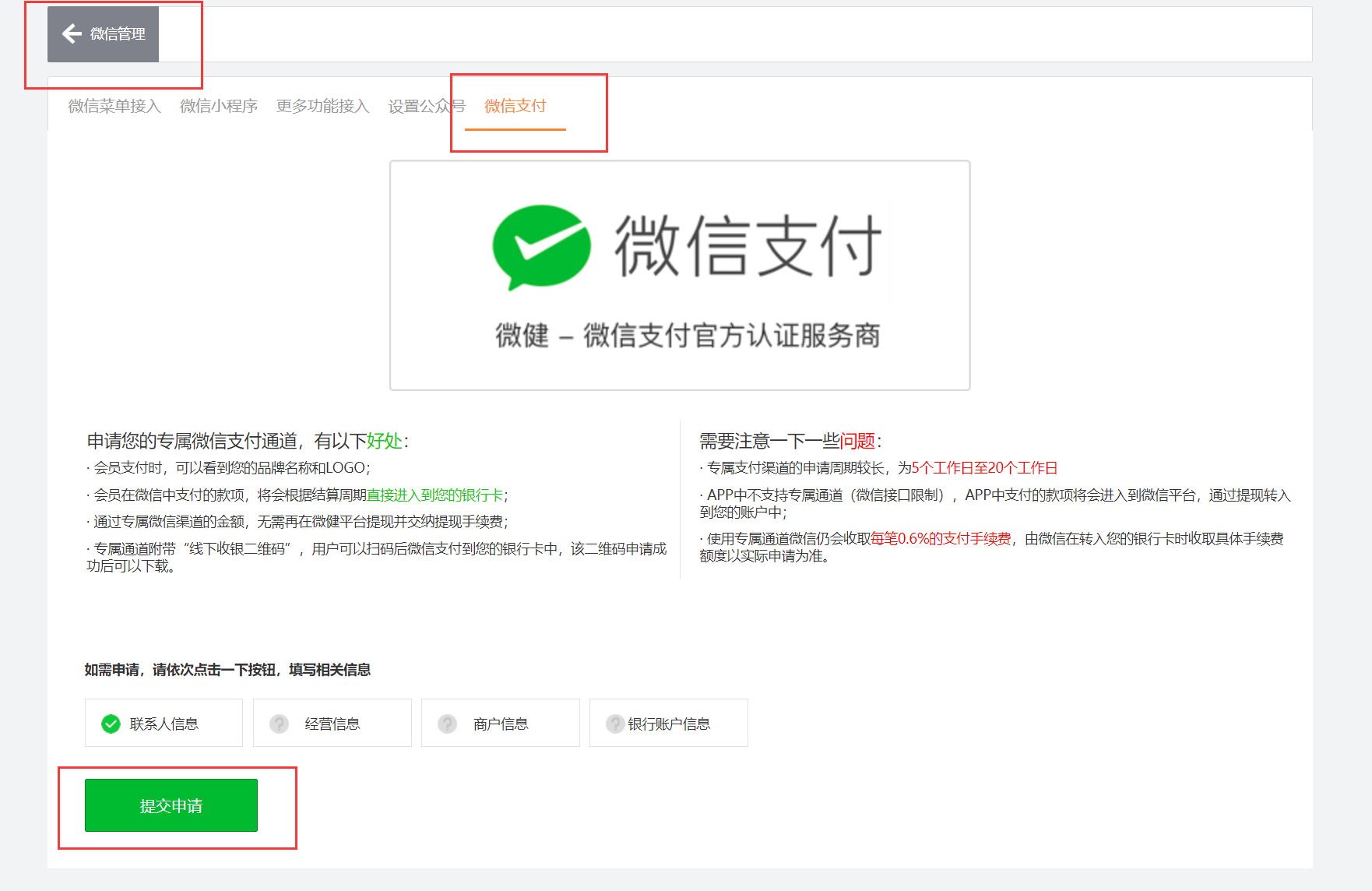 二、如果俱乐部用户用微信支付的比较,建议申请微信支付通道,这样用户支付成功微信审核通过后,会直接到当时绑定的银行里面,不需要在微健后台操作提现。
