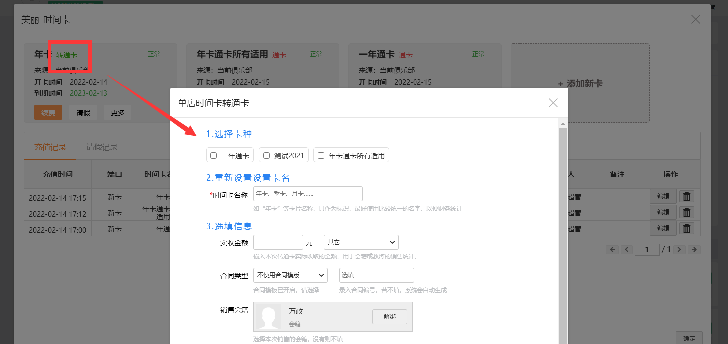 2、切换到单店,会员管理-搜索出会员信息-点相应卡进去卡片上有转通卡的字眼