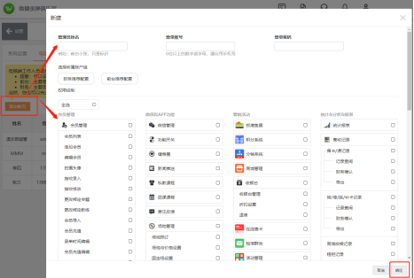 第二步:点击添加账号,输入工作人员的姓名,账号以及密码,需要什么权限勾选即可(也可使用推荐的权限,权限若不合适,后期都是可以更改的),点击确定,然后将账号和密码发给对应员工就可以登录系统操作了