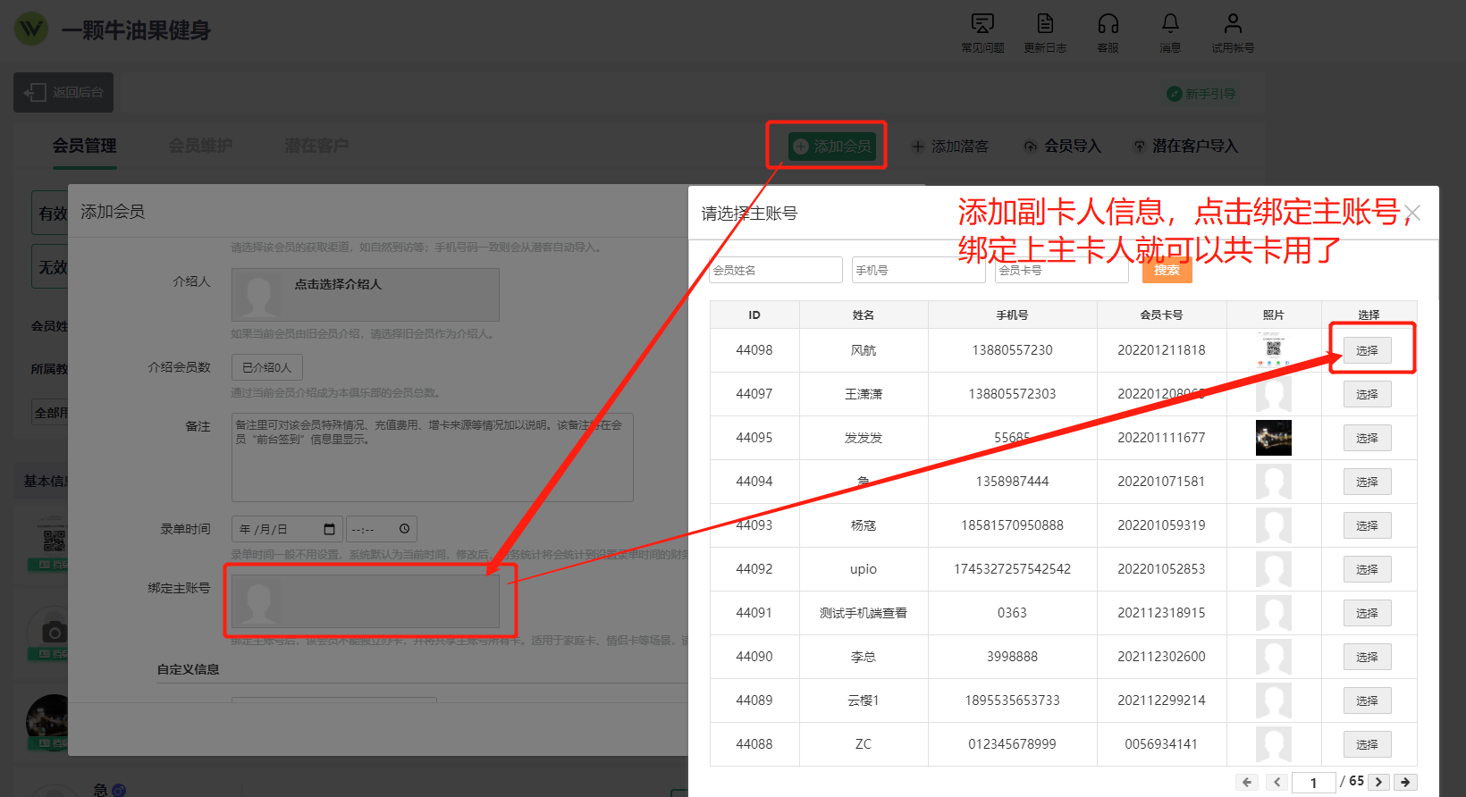 1、添加主账号人信息:按照普通会员的正常流程录入,会员管理-添加会员,充值录入卡信息(比如会员张三,办理双人年卡,充值好)