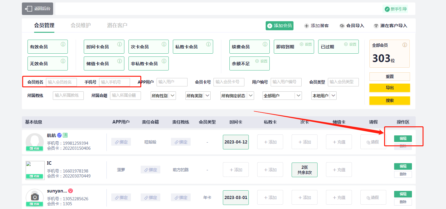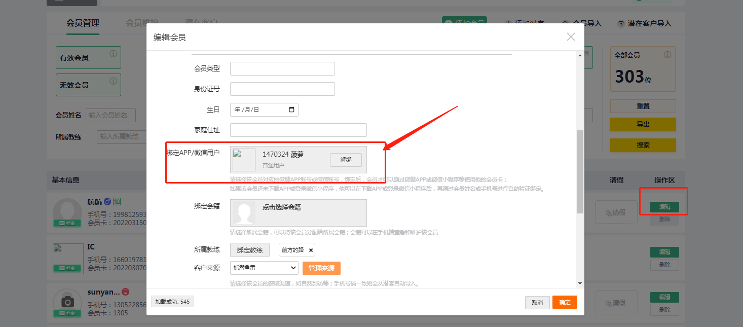 1、会员手机端退出登录,使用新的手机号登录并且加入到俱乐部 2、健身房工作人员登录电脑端账号 3、点击“会员管理”,搜索找到需要换手机号的会员 4、编辑会员,更改手机号 5、解绑APP用户,搜索绑定会员的新手机号 微信公众号入口操作: 微信号不变,联系微健工作人员,协助会员原手机号解绑,按2-4操作,会员从新进入微信公众号。 微信号换了,按2-4操作,用新的手机微信登录。